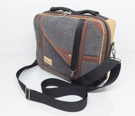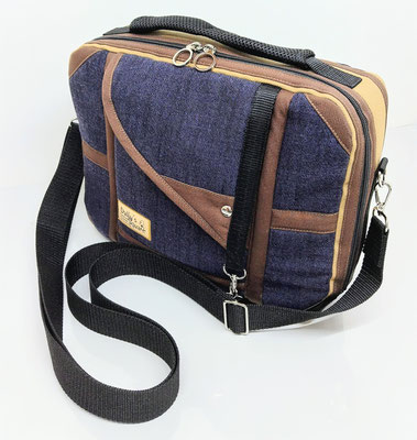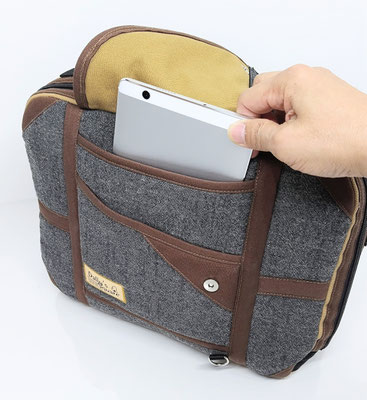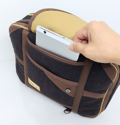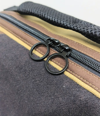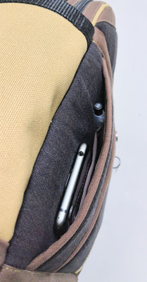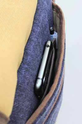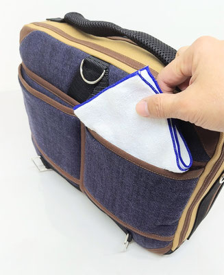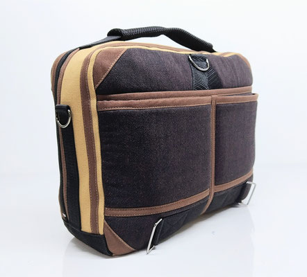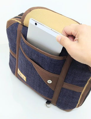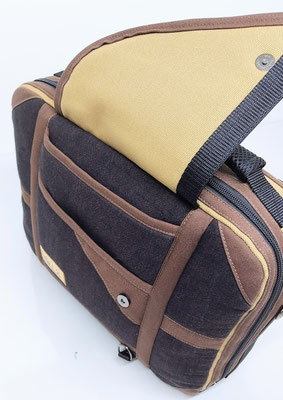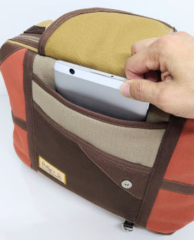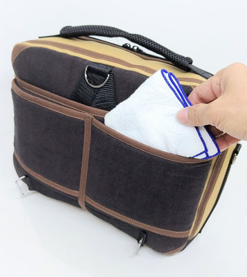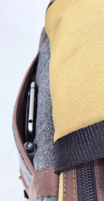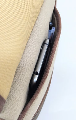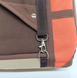 この工房の製品の特徴でもある三角形のフラップは、マグネットホックとナスカンを備えており、歩行での普段使いでマグネットホックを、自転車やバイクでの移動等で、収納物の飛び出し防止にナスカンを使うと便利です。