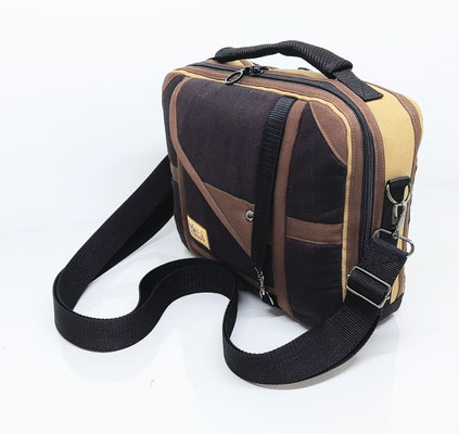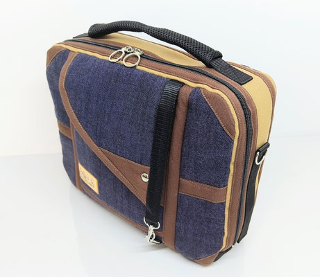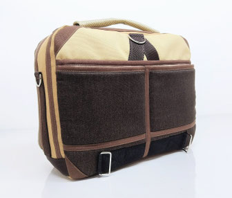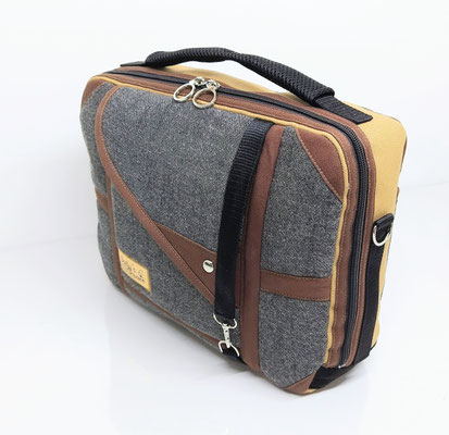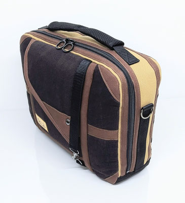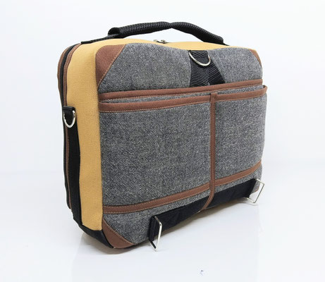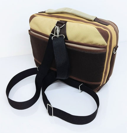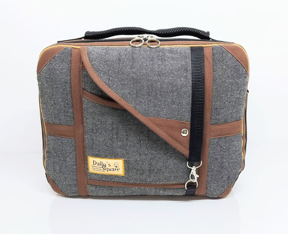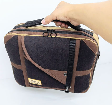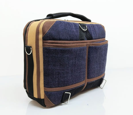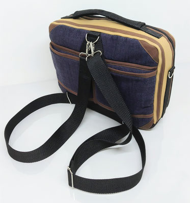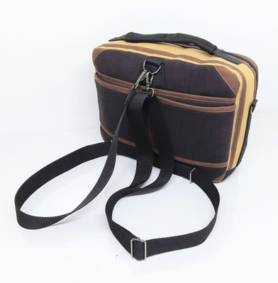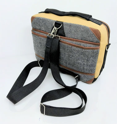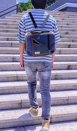 背面部下部の角カンにショルダーストラップを通し、上部の角カンへ取り付けると、リュックサックの様に背負う事も可能です。