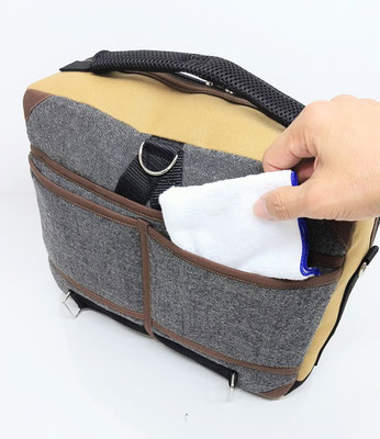 マチ部に硬めの補強を施し、しっかりと形を保持させており、布製ながら型崩れし難い構造となっています。