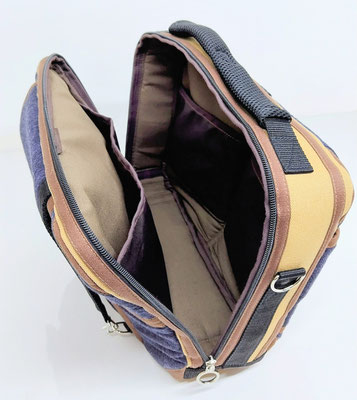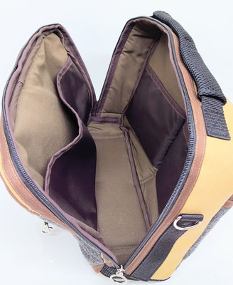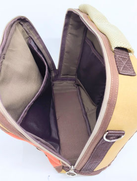 敢えて仕切りを省いてスッキリとした収納スペースで、前後に大小の内ポケットも備えています。