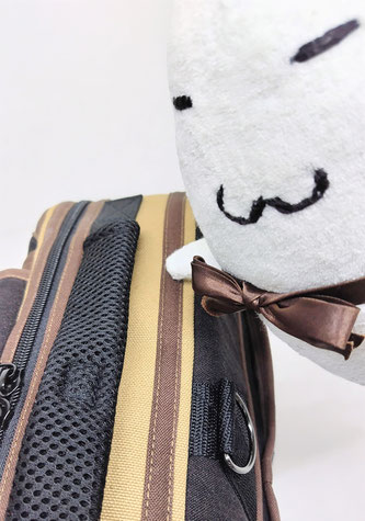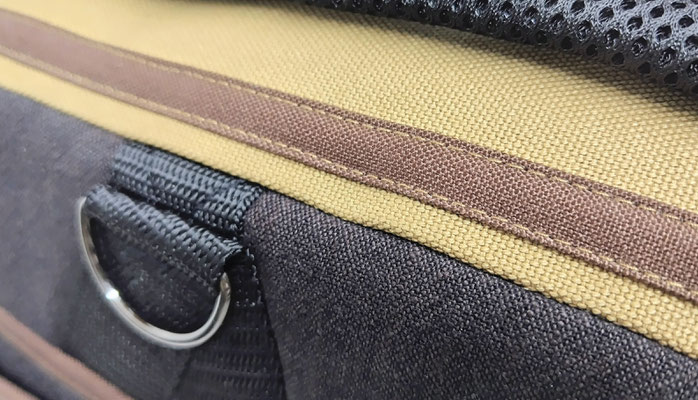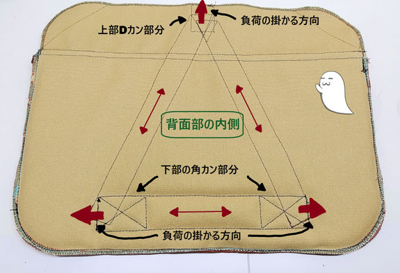 上部のDカンと下部の角カンをPPテープで繋げて補強を施し、本体に掛かる負荷を最小限に抑えており、変形し難い構造になっています。